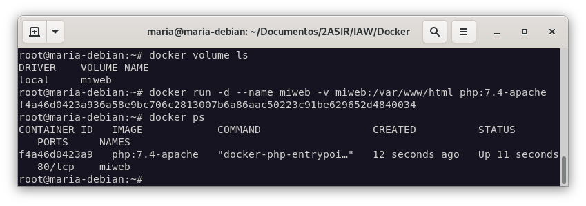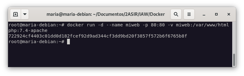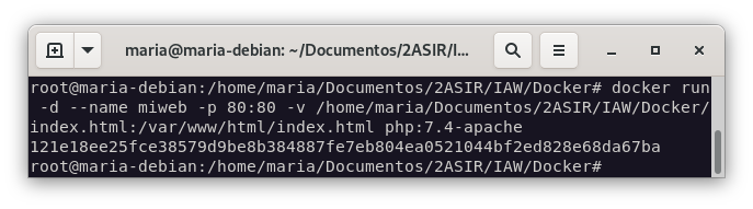 docker run -d --name miweb -p 80:80 -v /home/maria/Documentos/2ASIR/IAW/Docker/index.html:/var/www/html/index.html php:7.4-apache