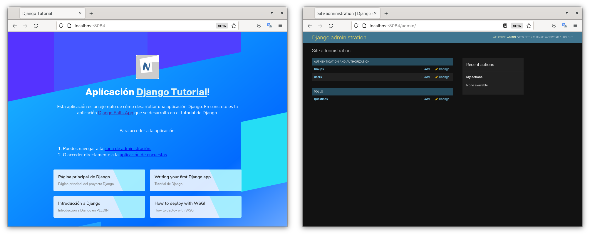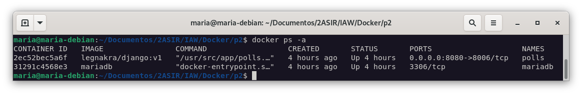 Ejecutando docker run -d --name polls --network django-net -p 8080:8006 legnakra/django:v1 podemos ver que la aplicación se ejecuta correctamente.