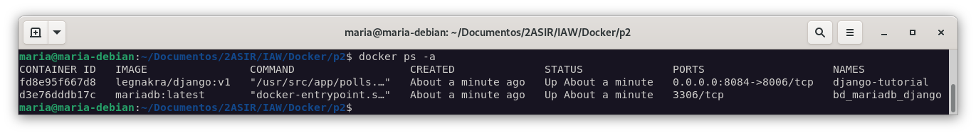 Tras ver como en la imagen anterior, todo funciona correctamente, nos disponemos a crear el docker-compose que levantará los dos contenedores que hemos creado.