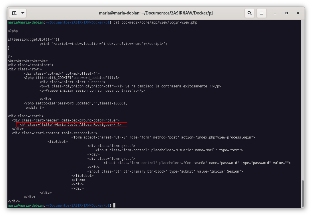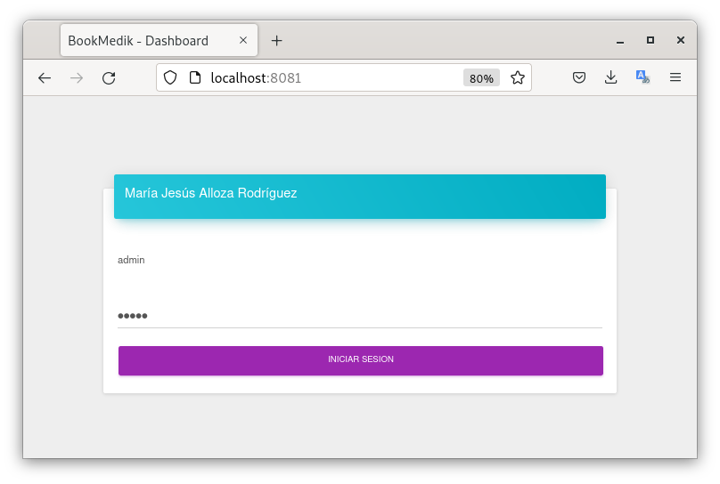 Vamos a modificar la aplicación para que nos muestre nuestro nombre en la línea <h4 class="title">Acceder a BookMedik</h4>.