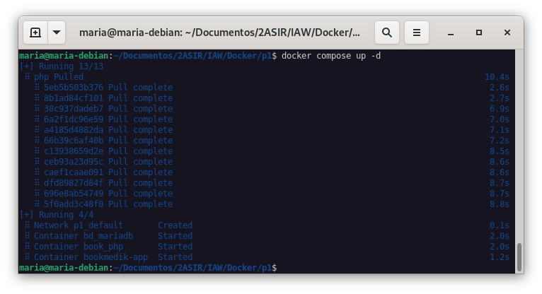 Realizamos la ejecución del comando docker-compose up -d y comprobamos que todo funciona correctamente: