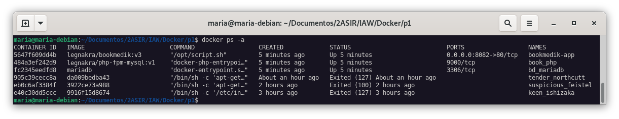 Levantamos el escenario con docker compose up -dy con docker ps podemos ver que los contenedores se han levantado correctamente: