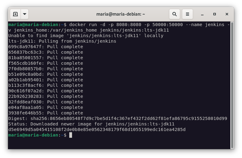 docker run -d -p 8080:8080 -p 50000:50000 --name jenkins -v jenkins_home:/var/jenkins_home jenkins/jenkins:lts-jdk11