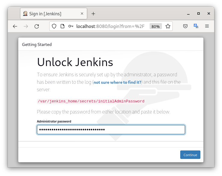 - Ingresamos en nuestro navegador la dirección http://localhost:8080 e introducimos la contraseña que hemos obtenido en el paso anterior y pulsamos en continuar.