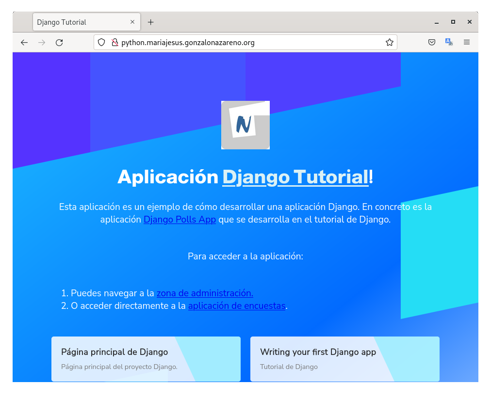 Vamos a configurar el servidor web apache2 con el módulo wsgi para servir la página web. Al utilizar como entorno de desarrollo la máquina bravo, se accederá con el nombre python.mariajesus.gonzalonazareno.org.