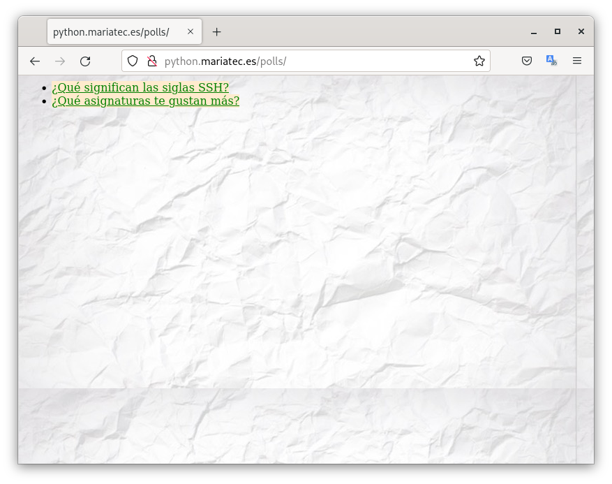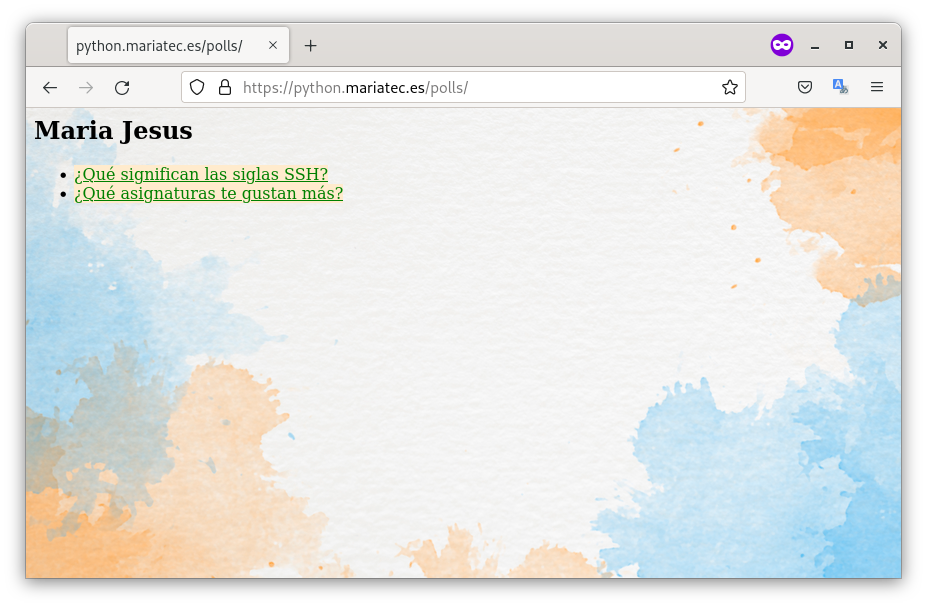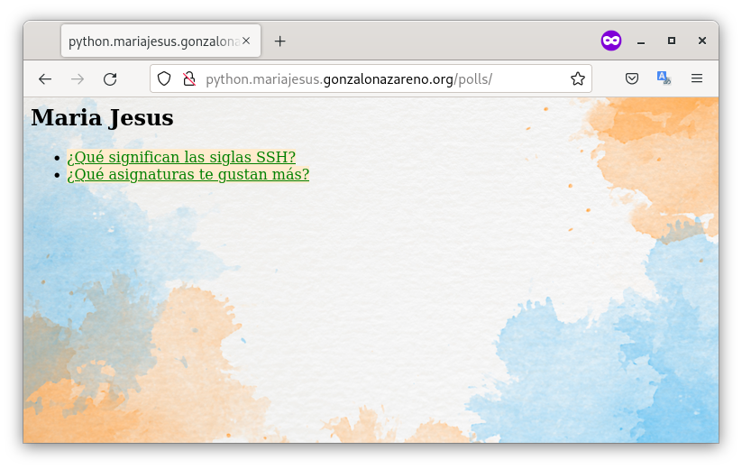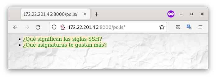 - Modifica la página inicial donde se ven las encuestas para que aparezca tu nombre, para ello modifica el archivo