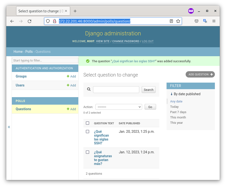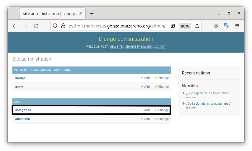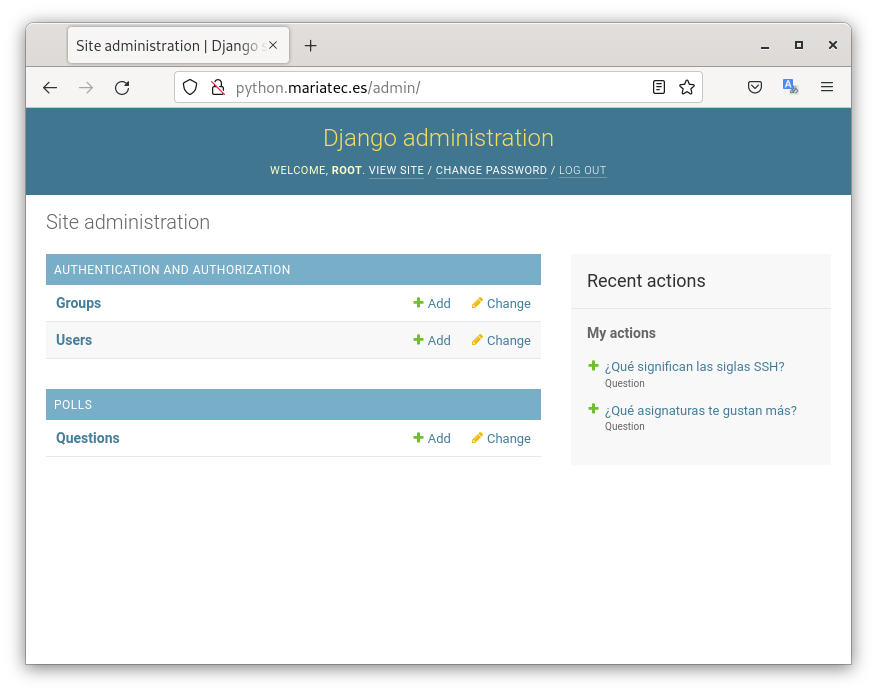 - Ejecutamos el servidor web de desarrollo y entramos en la zona de administración para comprobar que los datos se han almacenado correctamente: