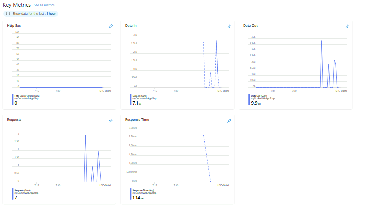 Una vez desplegada nuestra aplicación, si nos dirigimos a la información general de nuestra App Service, en la pestaña de Monitorización, podremos ver las métricas de nuestra app.