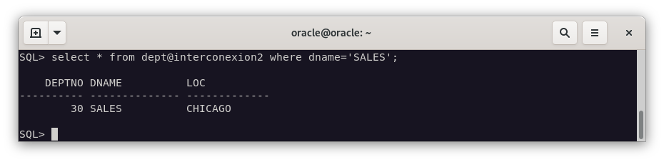 SQL> SELECT * FROM dept@interconexion2 WHERE dname = 'SALES';
