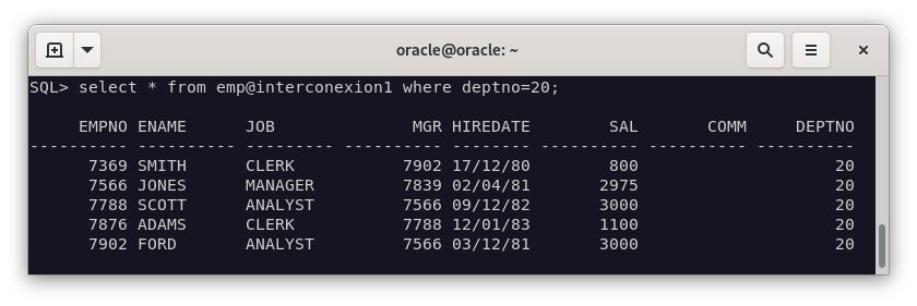 SQL> SELECT * FROM emp@interconexion1 WHERE deptno = 20;