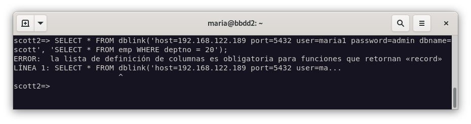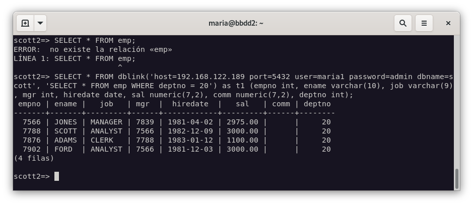 scott2=# SELECT * FROM dblink('host=192.168.122.189 port=5432 user=maria1 password=admin dbname=scott', 'SELECT * FROM emp WHERE deptno = 20') as t1 (empno int, ename varchar(10), job varchar(9), mgr int, hiredate date, sal numeric(7,2), comm numeric(7,2), deptno int);