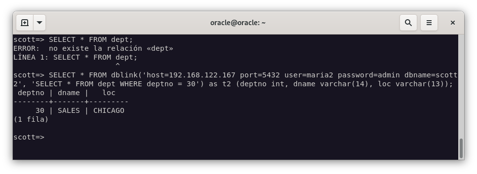 Realmente, ambas máquinas ya están configuradas para acceder a ellas de forma remota, ya que en el caso de oracle, hemos creado un usuario remoto y en el caso de postgresql, hemos abierto el puerto 5432. Pero, siendo dos gestores de bases de datos diferentes, vamos a realizar los enlaces de forma diferente.