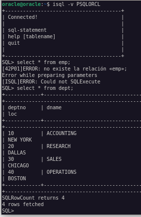 Y como podemos comprobar, la conexión funciona correctamente. En la imagen de a continuación podemos ver que se lista la tabla que sí existe en la base de datos de postgres, es decir, la tabla dept.
