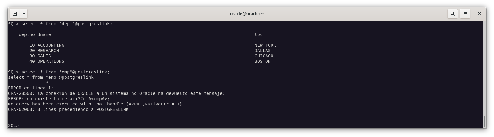 Ahora vamos a comprobar que la conexión entre los dos servidores funciona correctamente. Para ello, vamos a realizar una consulta en la máquina oracle, que es la que no tiene la tabla empleados, y vamos a ver si podemos acceder a ella.