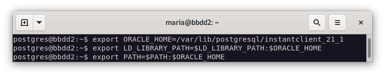 postgres@bbdd2:~$ export ORACLE_HOME=/var/lib/postgresql/instantclient_21_1