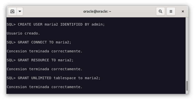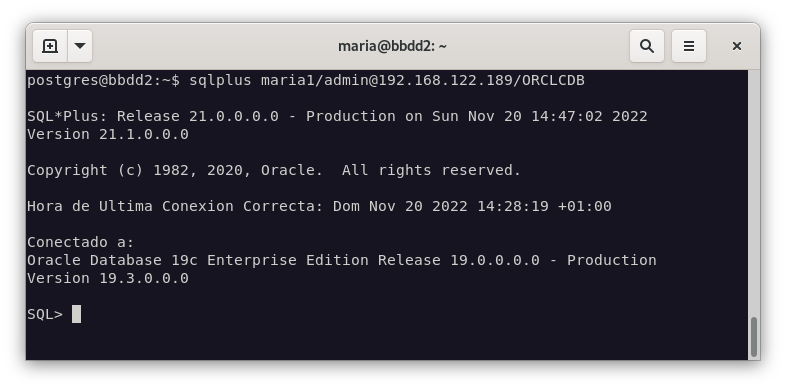 postgres@bbdd2:~$ sqlplus maria1/admin@192.168.122.189/ORCLCDB