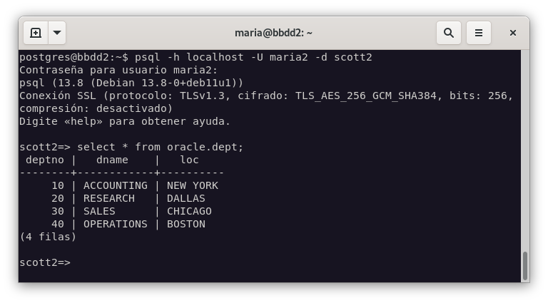En la máquina maria con ip 192.168.122.167 tenemos la base de datos scott2 con la tabla dept y en la máquina oracle con ip 192.168.122.189 tenemos la base de datos scott con la tabla emp.