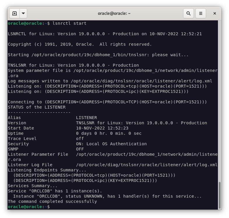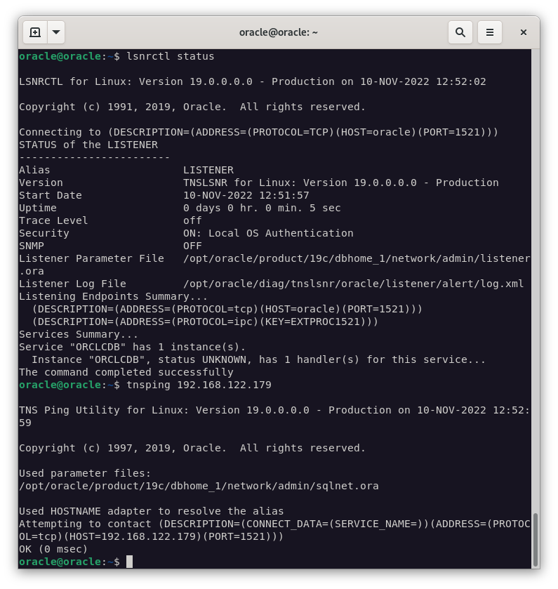 Ya creados los usuarios, también deberemos comprobar que el servicio de escucha de la base de datos está activo en cada una de las máquinas. Para ello, en cada una de las máquinas, ejecutamos el siguiente comando: