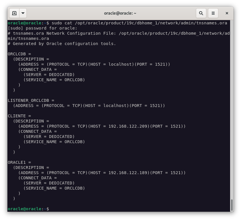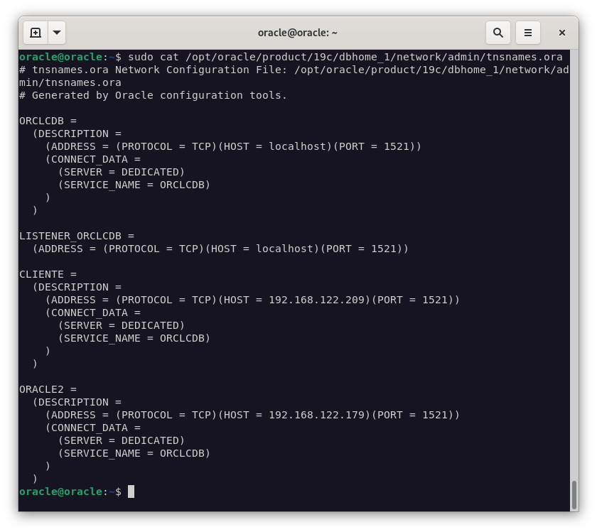 En este paso, vamos a añadirle una entrada a la tabla de enrutamiento de cada una de las máquinas, para que sepan cómo llegar al otro servidor. Para ello, en cada una de las máquinas, modificaremos el fichero tnsnames.ora, que se encuentra en la ruta $ORACLE_HOME/network/admin/.