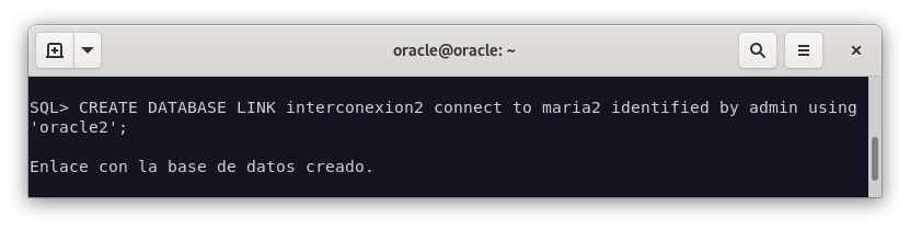 SQL> CREATE DATABASE LINK interconexion2 CONNECT TO maria2 IDENTIFIED BY admin USING 'ORACLE2';