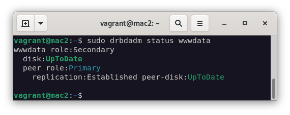 Al pasar escaso tiempo, podemos ver que el estado del recurso pasará a UpToDate/UpToDate. Esto quiere decir están sincronizados.