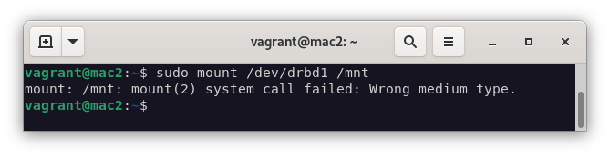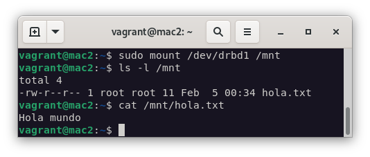 Si intentásemos montar el mismo recurso en la segunda máquina, no podríamos, ya que el recurso está en modo Secondary. Para poder montarlo, deberíamos desmontar el recurso, cambiar los roles y volver a montarlo pero en la segunda máquina: