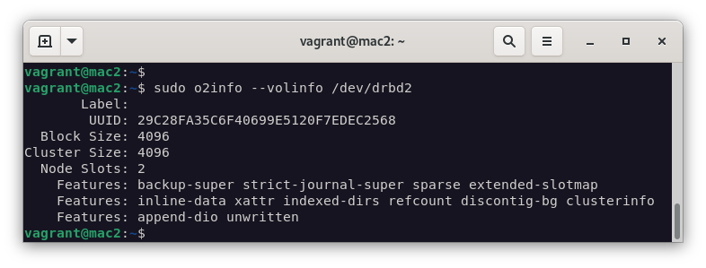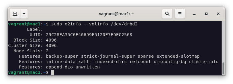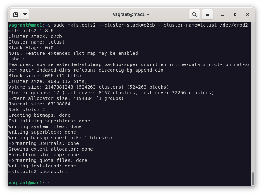 sudo mkfs.ocfs2 --cluster-stack=o2cb --cluster-name=tclust /dev/drbd2