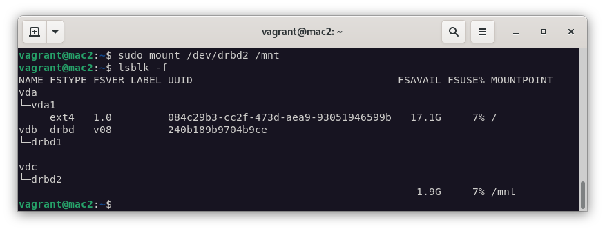 mount /dev/drbd2 /mnt