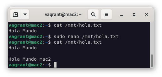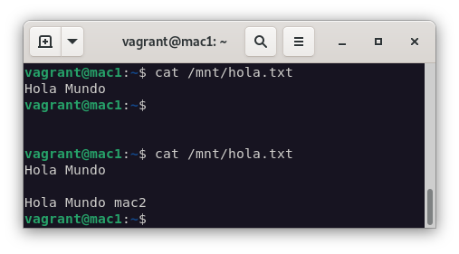 Para comprobar que funciona correctamente, vamos a crear un fichero en mac1 y lo vamos a editar desde mac2. Tras ello, comprobamos los cambios en mac1: