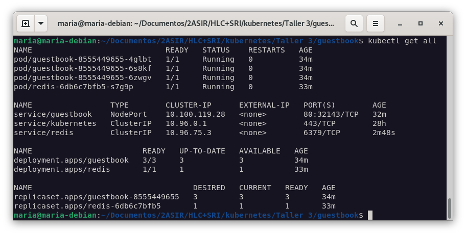 kubectl create -f guestbook-service.yamly comprobamos que se ha creado correctamente con el comandokubectl get all.