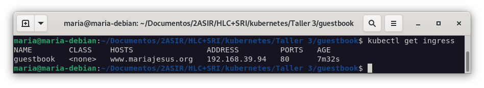 Vamos a crear el fichero yaml de definición del recurso Ingress para acceder a la aplicación. Indicaremos un host del tipo www.mariajesus.org, también el nombre del Service que creamos para acceder a la aplicación guestbook y tendremos que tener en cuenta que el puerto de dicho servicio era el 80. Para ello realizaremos los siguientes pasos: