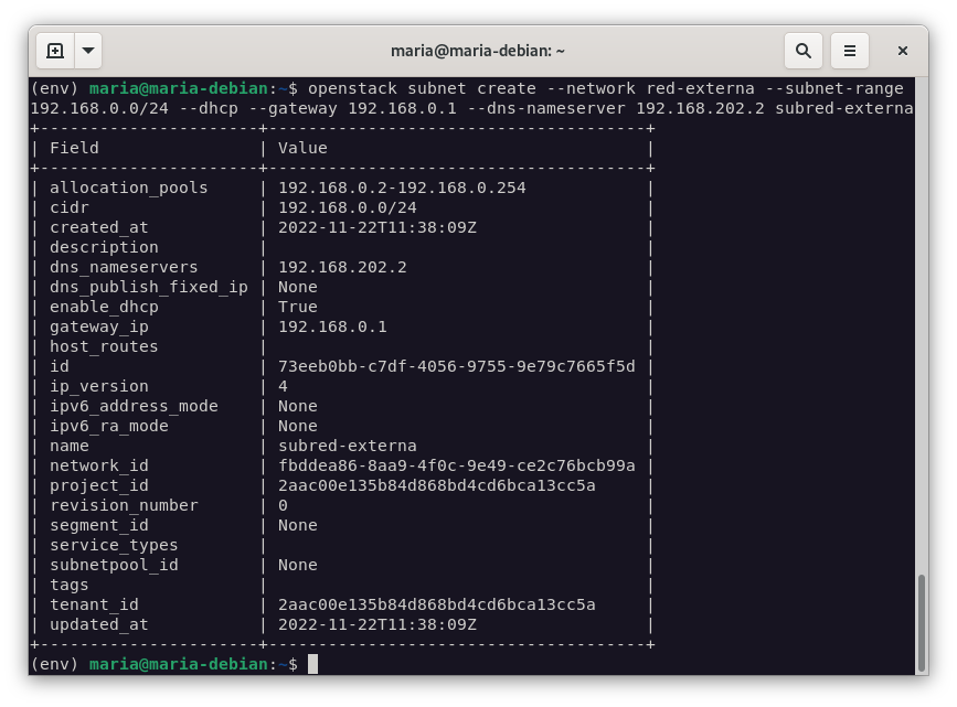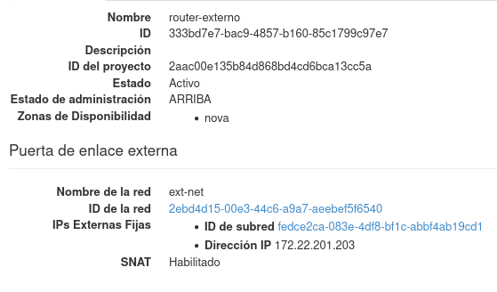 red-externay una subred con DHCP, DNS el192.168.202.2y direccionamiento192.168.0.0/24. Crearemos también un router y conectaremos ambas redes a este router.openstack network create red-externa+---------------------------+--------------------------------------+ | Field | Value | +---------------------------+--------------------------------------+ | admin_state_up | UP | | availability_zone_hints | | | availability_zones | | | created_at | 2022-12-04T20:29:15Z | | description | | | dns_domain | None | | id | 50f75d96-bc22-4ce6-aab5-fbfac98032cc | | ipv4_address_scope | None | | ipv6_address_scope | None | | is_default | False | | is_vlan_transparent | None | | mtu | 1450 | | name | red-externa | | port_security_enabled | True | | project_id | 2aac00e135b84d868bd4cd6bca13cc5a | | provider:network_type | None | | provider:physical_network | None | | provider:segmentation_id | None | | qos_policy_id | None | | revision_number | 1 | | router:external | Internal | | segments | None | | shared | False | | status | ACTIVE | | subnets | | | tags | | | tenant_id | 2aac00e135b84d868bd4cd6bca13cc5a | | updated_at | 2022-12-04T20:29:15Z | +---------------------------+--------------------------------------+openstack subnet create --network red-externa --subnet-range 192.168.0.0/24 --dhcp --gateway 192.168.0.1 --dns-nameserver 192.168.202.2 subred-externa+----------------------+--------------------------------------+ | Field | Value | +----------------------+--------------------------------------+ | allocation_pools | 192.168.0.2-192.168.0.254 | | cidr | 192.168.0.0/24 | | created_at | 2022-12-04T20:30:16Z | | description | | | dns_nameservers | 192.168.202.2 | | dns_publish_fixed_ip | None | | enable_dhcp | True | | gateway_ip | 192.168.0.1 | | host_routes | | | id | 77b06357-36d5-4aac-a06d-d048964939d5 | | ip_version | 4 | | ipv6_address_mode | None | | ipv6_ra_mode | None | | name | subred-externa | | network_id | 50f75d96-bc22-4ce6-aab5-fbfac98032cc | | project_id | 2aac00e135b84d868bd4cd6bca13cc5a | | revision_number | 0 | | segment_id | None | | service_types | | | subnetpool_id | None | | tags | | | tenant_id | 2aac00e135b84d868bd4cd6bca13cc5a | | updated_at | 2022-12-04T20:30:16Z | +----------------------+--------------------------------------+