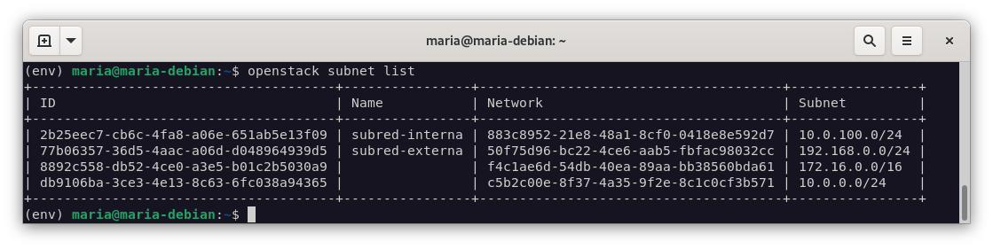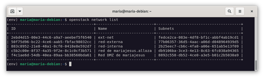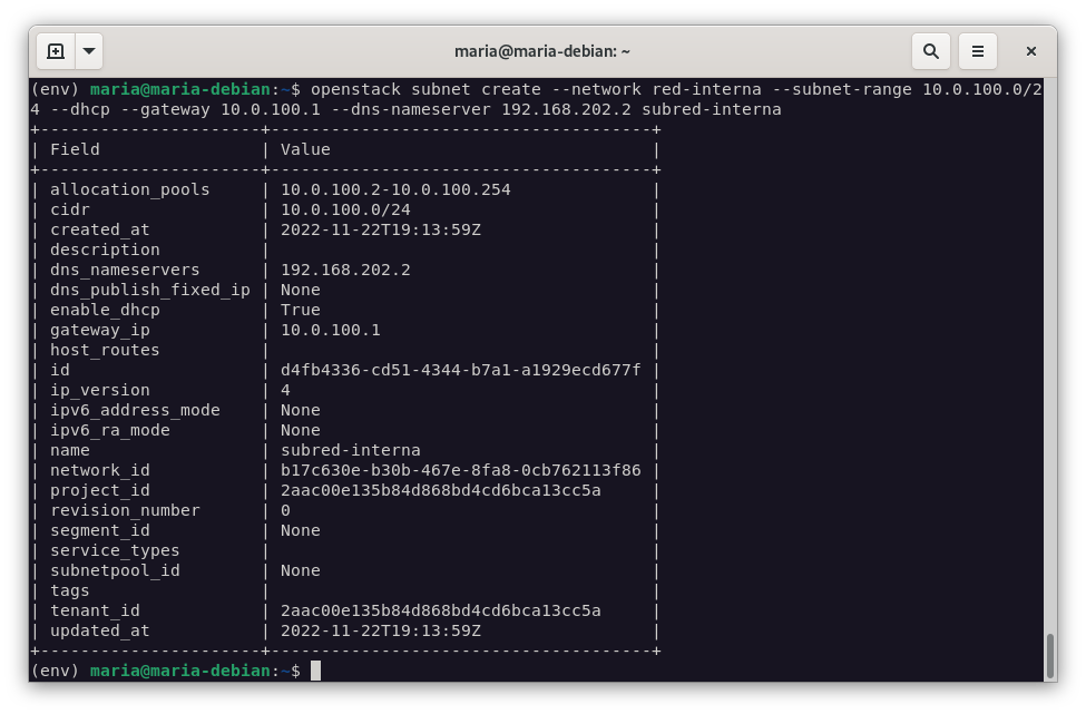 red-internacon una subred con DHCP, DNS el192.168.202.2y direccionamiento10.0.100.0/24.openstack network create red-interna+---------------------------+--------------------------------------+ | Field | Value | +---------------------------+--------------------------------------+ | admin_state_up | UP | | availability_zone_hints | | | availability_zones | | | created_at | 2022-12-04T20:36:32Z | | description | | | dns_domain | None | | id | 883c8952-21e8-48a1-8cf0-0418e8e592d7 | | ipv4_address_scope | None | | ipv6_address_scope | None | | is_default | False | | is_vlan_transparent | None | | mtu | 1450 | | name | red-interna | | port_security_enabled | True | | project_id | 2aac00e135b84d868bd4cd6bca13cc5a | | provider:network_type | None | | provider:physical_network | None | | provider:segmentation_id | None | | qos_policy_id | None | | revision_number | 1 | | router:external | Internal | | segments | None | | shared | False | | status | ACTIVE | | subnets | | | tags | | | tenant_id | 2aac00e135b84d868bd4cd6bca13cc5a | | updated_at | 2022-12-04T20:36:32Z | +---------------------------+--------------------------------------+openstack subnet create --network red-interna --subnet-range 10.0.100.0/24 --dhcp --gateway 10.0.100.1 --dns-nameserver 192.168.202.2 subred-interna+----------------------+--------------------------------------+ | Field | Value | +----------------------+--------------------------------------+ | allocation_pools | 10.0.100.2-10.0.100.254 | | cidr | 10.0.100.0/24 | | created_at | 2022-12-04T20:37:21Z | | description | | | dns_nameservers | 192.168.202.2 | | dns_publish_fixed_ip | None | | enable_dhcp | True | | gateway_ip | 10.0.100.1 | | host_routes | | | id | 2b25eec7-cb6c-4fa8-a06e-651ab5e13f09 | | ip_version | 4 | | ipv6_address_mode | None | | ipv6_ra_mode | None | | name | subred-interna | | network_id | 883c8952-21e8-48a1-8cf0-0418e8e592d7 | | project_id | 2aac00e135b84d868bd4cd6bca13cc5a | | revision_number | 0 | | segment_id | None | | service_types | | | subnetpool_id | None | | tags | | | tenant_id | 2aac00e135b84d868bd4cd6bca13cc5a | | updated_at | 2022-12-04T20:37:21Z | +----------------------+--------------------------------------+