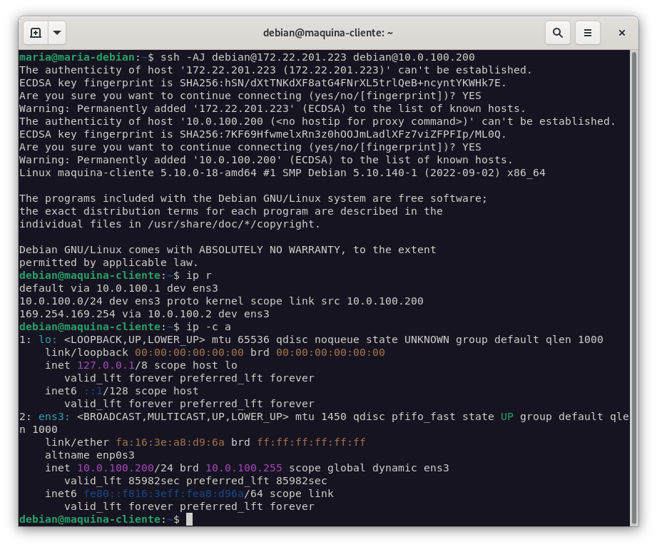 ssh -AJ debian@172.22.201.223 debian@10.0.100.200 - Nos conectamos a la máquina-cliente a través de la máquina router usando