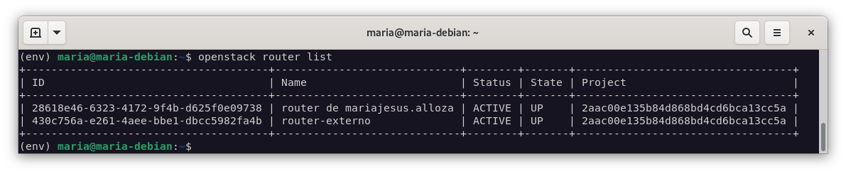 maria@maria-debian:~$ openstack floating ip create ext-net +---------------------+--------------------------------------+ | Field | Value | +---------------------+--------------------------------------+ | created_at | 2022-12-04T20:35:28Z | | description | | | dns_domain | None | | dns_name | None | | fixed_ip_address | None | | floating_ip_address | 172.22.201.223 | | floating_network_id | 2ebd4d15-00e3-44c6-a9a7-aeebef5f6540 | | id | e7075044-807b-4a69-87df-efb96b237358 | | name | 172.22.201.223 | | port_details | None | | port_id | None | | project_id | 2aac00e135b84d868bd4cd6bca13cc5a | | qos_policy_id | None | | revision_number | 0 | | router_id | None | | status | DOWN | | subnet_id | None | | tags | [] | | tenant_id | 2aac00e135b84d868bd4cd6bca13cc5a | | updated_at | 2022-12-04T20:35:28Z | +---------------------+--------------------------------------+ openstack server add floating ip maquina-router 172.22.201.223