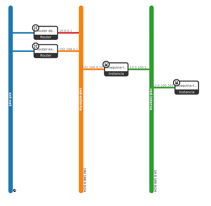 máquina-routera la nueva red y le asignamos la primera dirección:10.0.100.1.openstack port create --network red-interna --fixed-ip ip-address=10.0.100.1 puerto-interno+-------------------------+---------------------------------------------------------------------------+ | Field | Value | +-------------------------+---------------------------------------------------------------------------+ | admin_state_up | UP | | allowed_address_pairs | | | binding_host_id | None | | binding_profile | None | | binding_vif_details | None | | binding_vif_type | None | | binding_vnic_type | normal | | created_at | 2022-12-04T20:38:34Z | | data_plane_status | None | | description | | | device_id | | | device_owner | | | device_profile | None | | dns_assignment | None | | dns_domain | None | | dns_name | None | | extra_dhcp_opts | | | fixed_ips | ip_address='10.0.100.1', subnet_id='2b25eec7-cb6c-4fa8-a06e-651ab5e13f09' | | id | f795c9c0-3a3d-4b64-800e-8f1833716b38 | | ip_allocation | None | | mac_address | fa:16:3e💿a7:50 | | name | puerto-interno | | network_id | 883c8952-21e8-48a1-8cf0-0418e8e592d7 | | numa_affinity_policy | None | | port_security_enabled | True | | project_id | 2aac00e135b84d868bd4cd6bca13cc5a | | propagate_uplink_status | None | | qos_network_policy_id | None | | qos_policy_id | None | | resource_request | None | | revision_number | 1 | | security_group_ids | ea2781f0-7c84-46b5-873c-a4986b14f232 | | status | DOWN | | tags | | | tenant_id | 2aac00e135b84d868bd4cd6bca13cc5a | | trunk_details | None | | updated_at | 2022-12-04T20:38:34Z | +-------------------------+---------------------------------------------------------------------------+openstack server add port maquina-router puerto-interno -