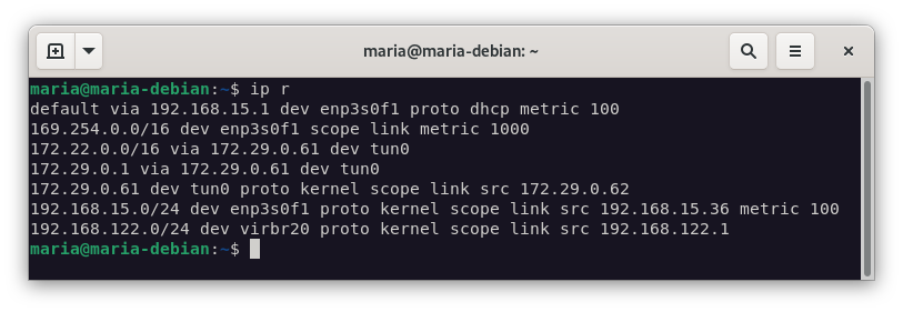 Reiniciamos el servicio y comprobaremos que se haya creado correctamente el tunel y que la regla de encaminamiento adicional para acceder a los equipos que pertenecen a la red local del centro se haya añadido correctamente.
