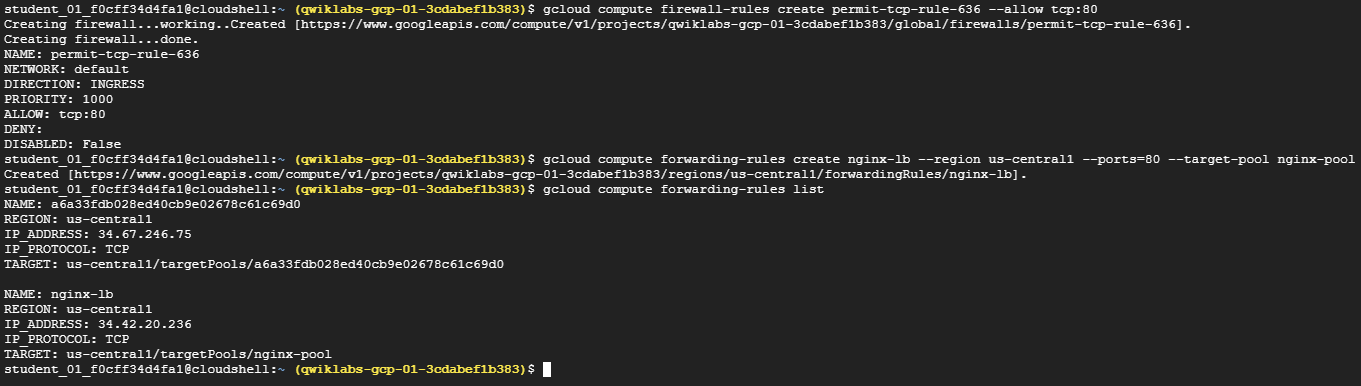 gcloud compute forwarding-rules create nginx-lb --region us-central1 --ports=80 --target-pool nginx-pool