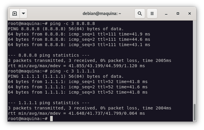 Y comprobamos que podemos realizar la ejecución de ping -c 5 1.1.1.1: