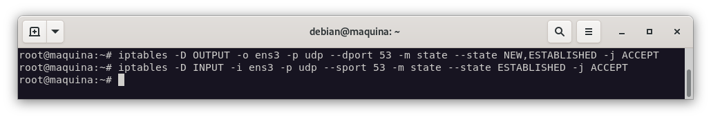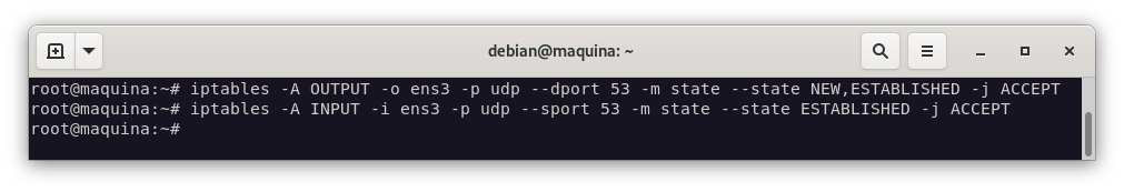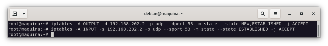 Añadimos las reglas nuevas, que nos permitirán hacer consultas DNS sólo al servidor