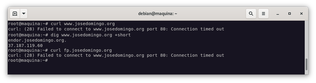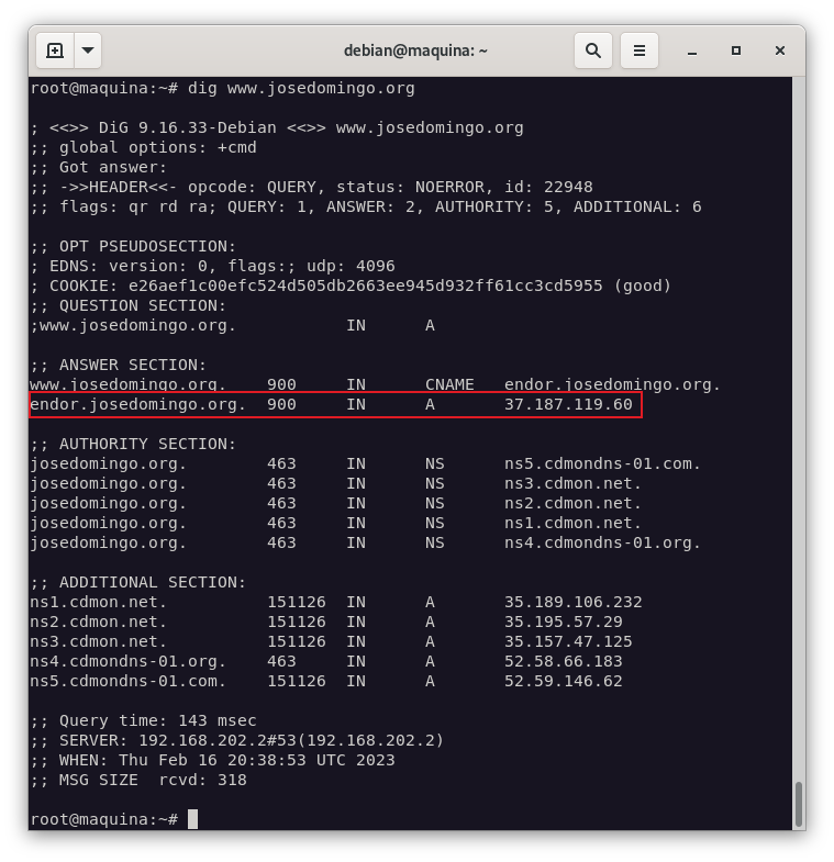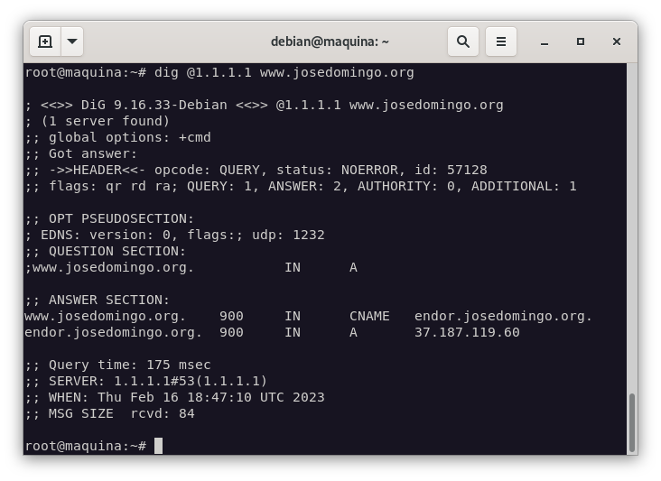 Y comprobamos que funciona haciendo una consulta dns a www.josedomingo.org: