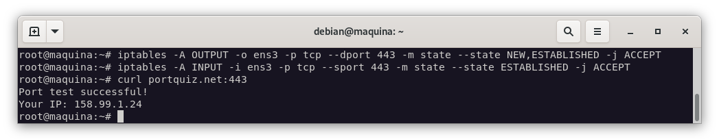 Tras implementar estas reglas, podemos comprobar que podemos hacer una conexión ssh al exterior: