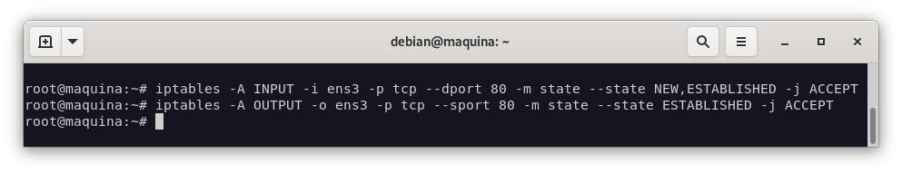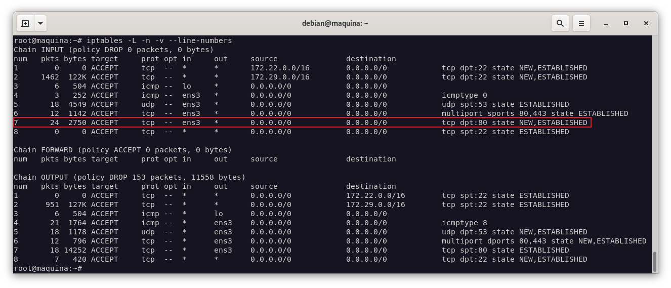 Con estas reglas, podremos permitir las peticiones http. Para comprobarlo, vamos a realizarlo con la ejecución del comando curl: