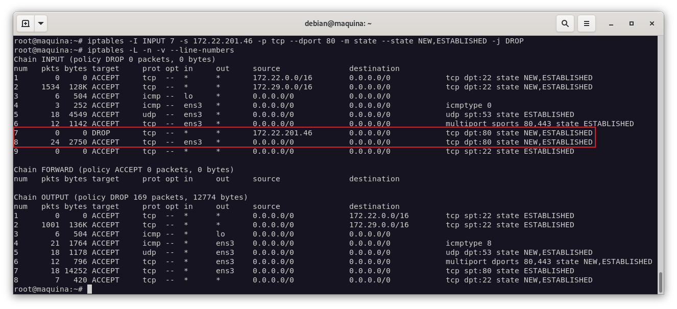 Una vez sabido esto, añadimos la regla que nos permite denegar el acceso a una ip concreta, en mi caso, la ip de mi máquina alfa de mi escenario: