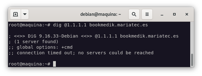 Una vez incluidas, comprobamos que no podemos hacer una consulta DNS. La primera consulta la haremos al dns 1.1.1.1: