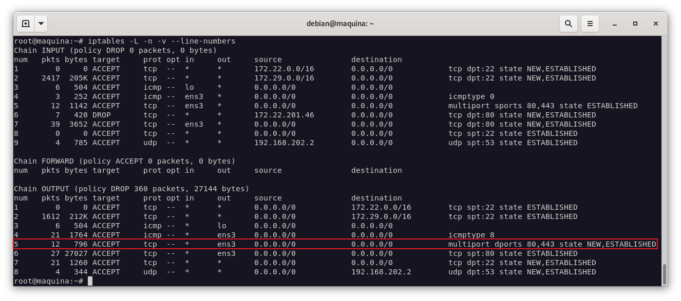 Podemos hacer un par de reglas que permitan el tráfico http/https (los dos puntos anteriores) usando la extensión multiport:
