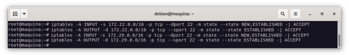 Cómo estamos conectado a la máquina por ssh, vamos a permitir la conexión ssh desde la red 172.22.0.0/16, antes de cambiar las políticas por defecto a DROP, para no perder la conexión: