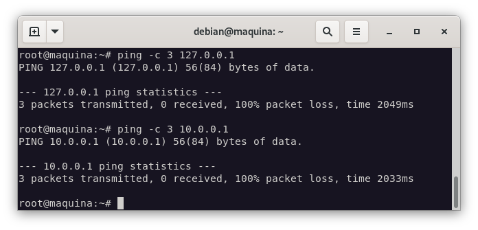 Y comprobamos que no podemos hacer ping ni a la máquina ni a internet: