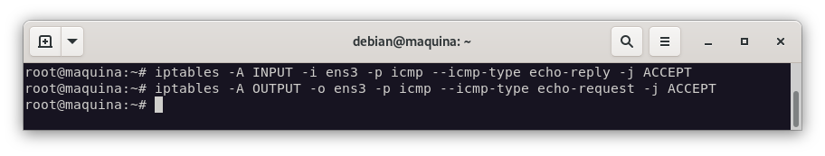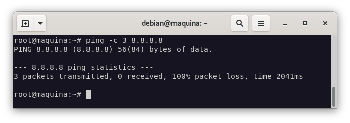 Vamos a añadir las reglas necesarias para permitir las peticiones y respuestas del protocolo ICMP, pero primero, comprobemos que no tenemos conexión a internet: