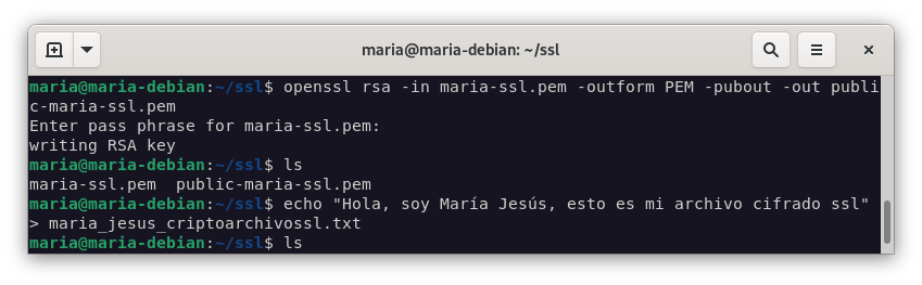 echo "Hola, soy María Jesús, esto es mi archivo cifrado ssl" > maria_jesus_criptoarchivossl.txt openssl rsautl -encrypt -inkey juanje-ssl.pub.pem -pubin -in maria_jesus_criptoarchivossl.txt -out maria_jesus_criptoarchivossl.txt.enc